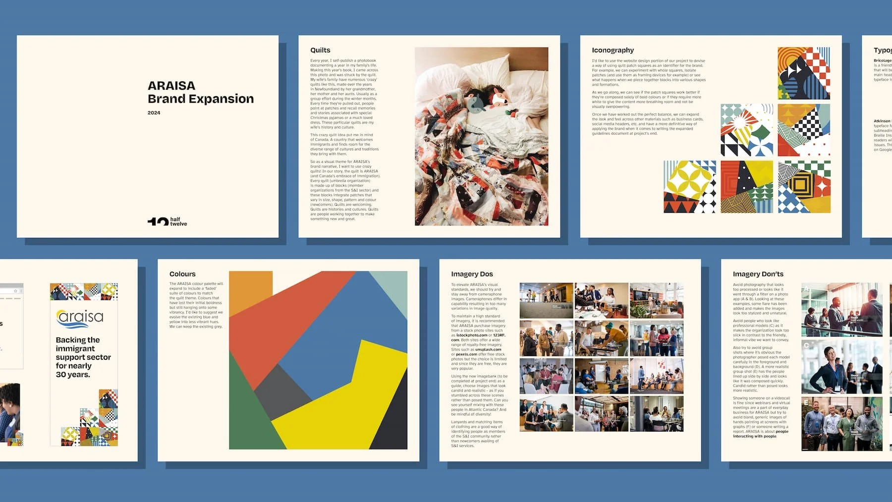 We evolved ARAISA’s brand into something more flexible and adaptable by creating an expanded toolkit. It featured a collection of interchangeable quilt block graphics, a colour palette inspired by once-vibrant hues that had softened over time (like fabric gently faded by years of washing) and a typographic system that ensured accessibility for readers with impaired vision.